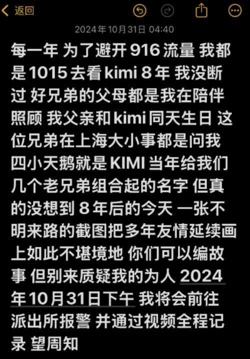 除此以外,朱桢还发了一张手机记事本的纪录,上头提到了每年王人会遁入916(9月16日),王人是1015去看kimi,8年莫得断过,kimi的父母王人是他在随同珍贵。没思到8年后,一张不解来路的截图,把多年友情面容得如斯不胜。