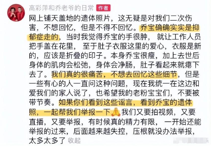 近日,针对这些越来越离谱的假话,乔任梁的父母发文正面回复,不但进行了辟谣,还说出了好多信得过的细节:乔任梁是抑郁症走的,因为物化的技艺手照旧肿的,是以才让责任主谈主员把手盖在花里。乔任梁自己就很瘦,加上物化后躯壳的肌肉会自便,是以肚子看起来就瘪下去了。